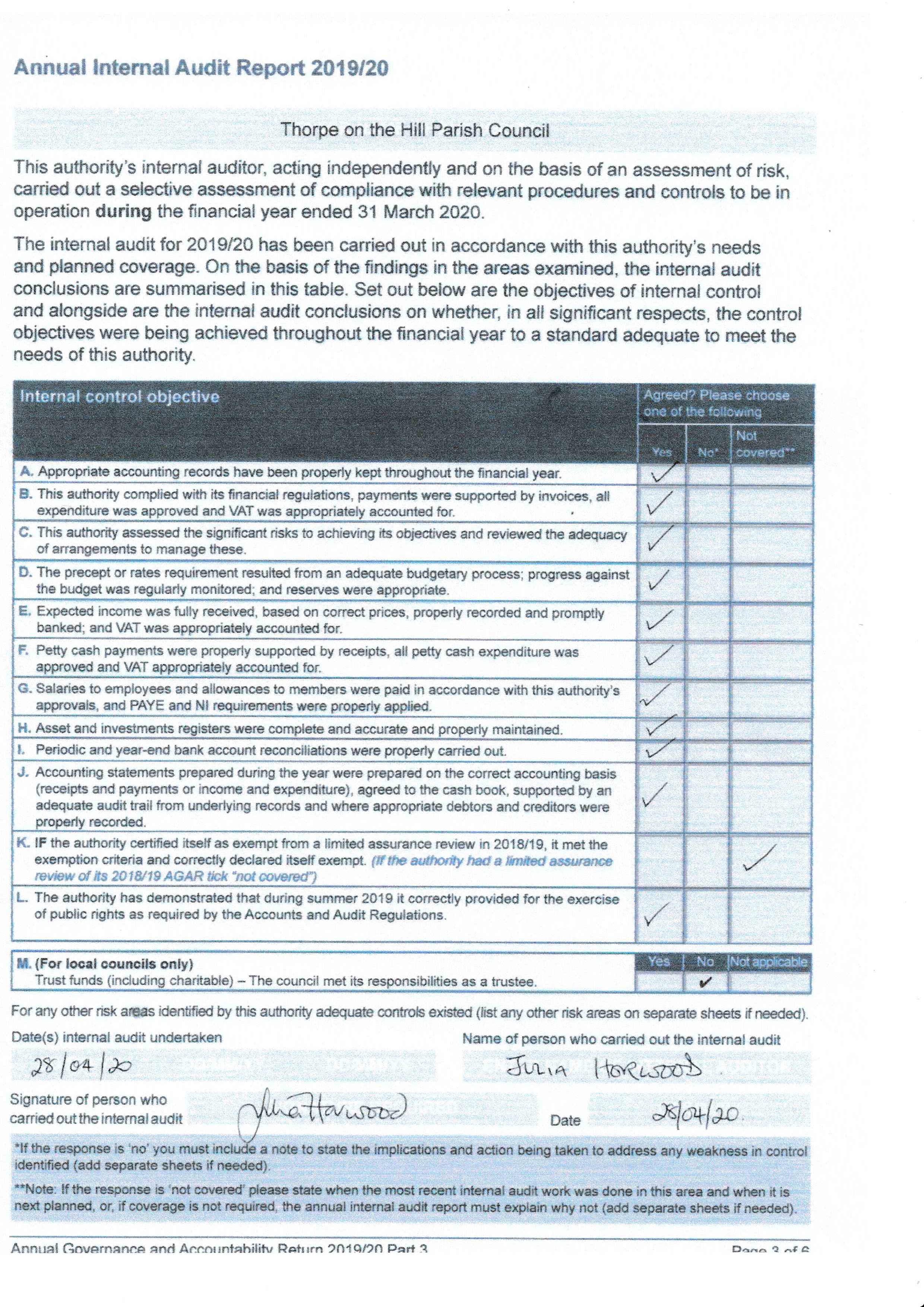 Certificate from external auditors to certify the review of account in year 2019 2020 including annual governance statement, Internal Auditors report and notice of conclusion of audit